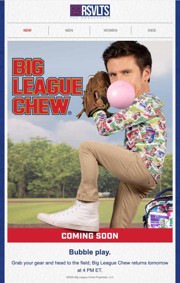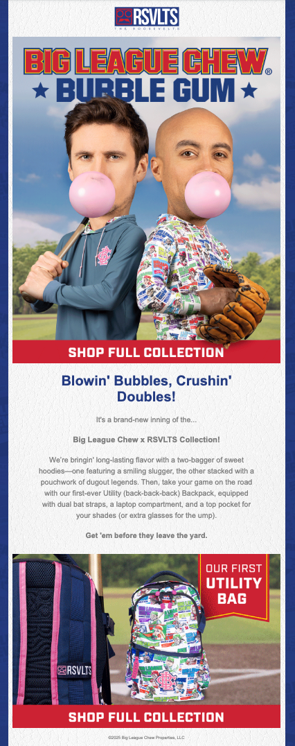 Big League Chew is a brand I’ve collaborated with across multiple launches including hoodies, button-ups, hats, backpacks, and jackets. This collection leaned into the energy of blowing a bubble, oversized mascot heads, and that classic Little League nostalgia. With a fast turnaround, we delivered a clean, high-impact studio shoot that captured the brand’s playful tone through bold lighting, sharp composition, and vibrant color. The campaign expanded across paid media, social, web, email, and video, unified under one cohesive creative strategy. I led the concept, directed photography and post-production, and oversaw asset design and storytelling across every platform. The result was a high-energy campaign that brought Big League Chew’s fun, nostalgic personality to life with style and consistency.