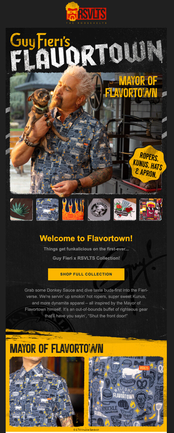 This campaign celebrated the bold personality of Guy Fieri by launching the official Flavortown x RSVLTS collection. The creative strategy pulled directly from Guy’s signature style, vibrant graphics, bold typography, and high-energy photography to bring his brand to life across email, social, web, and paid media.