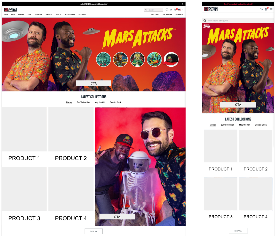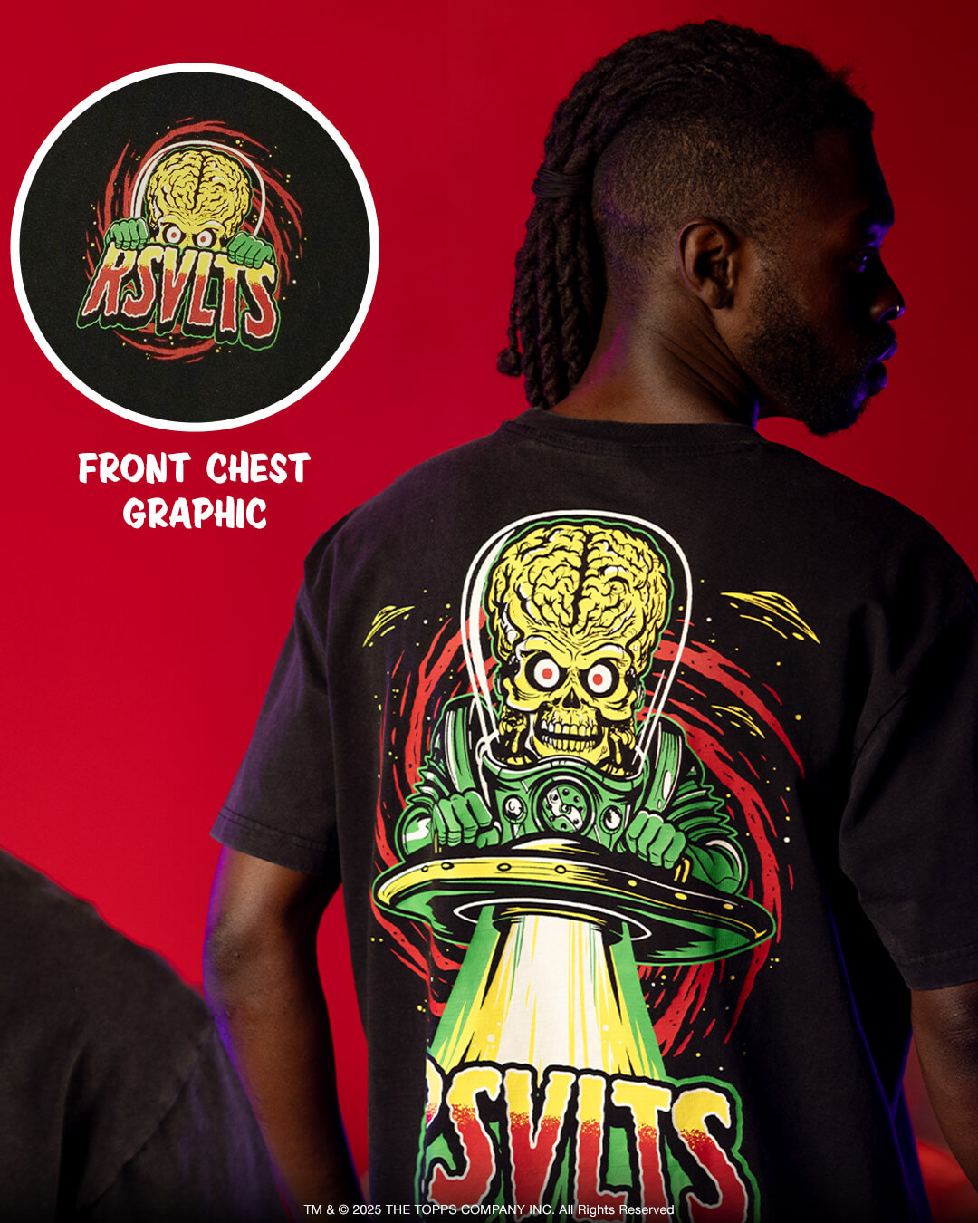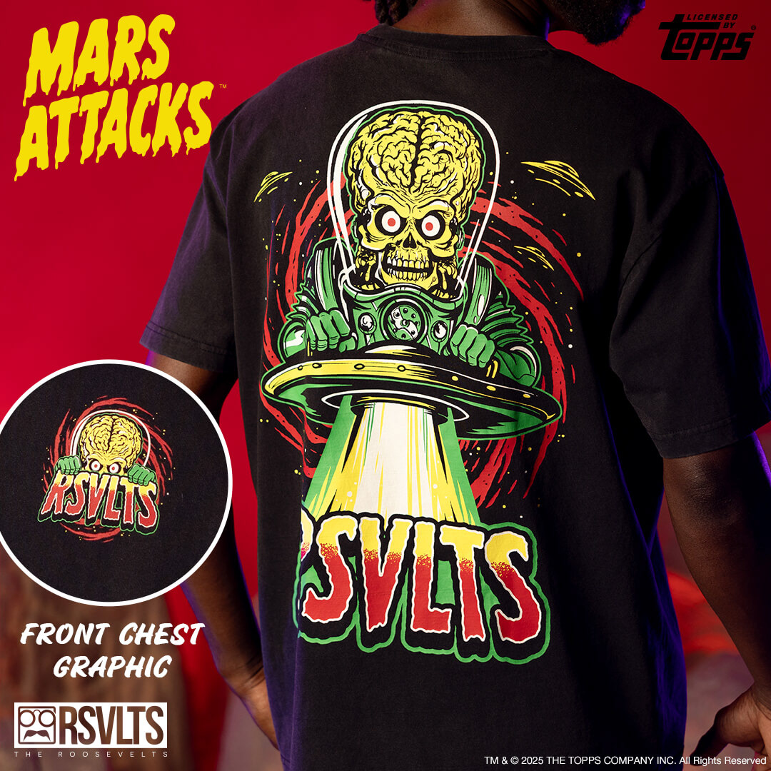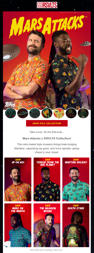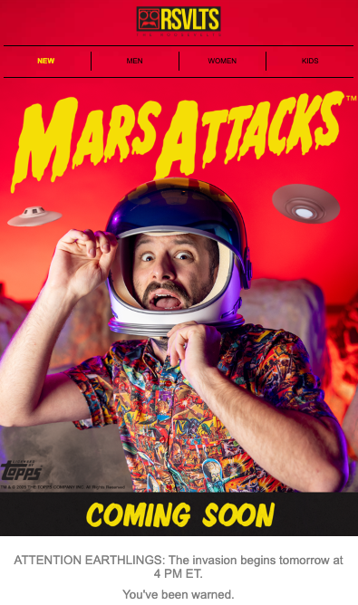 When 1960s sci-fi trading cards invade your wardrobe, you get our Mars Attacks campaign. RSVLTS partnered with Topps to reimagine the original cards as a collection of shirts, tees, and hats, using the bold reds, yellows, greens, and blacks as our guiding palette. A glowing desert cast in blue light set the stage, complete with 3D saucers hovering above to finish the invasion. For the first time, RSVLTS branding was integrated directly into the apparel designs, a detail fans quickly noticed, helping the campaign reach 330K+ inboxes, drive $60K+ in email revenue with a 67% open rate, and generate buzz amplified by the fan community.