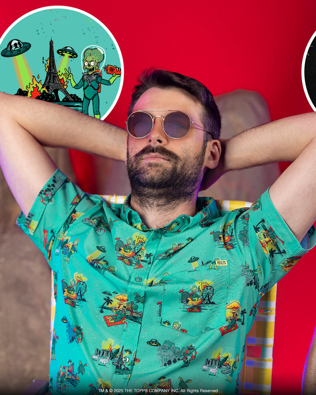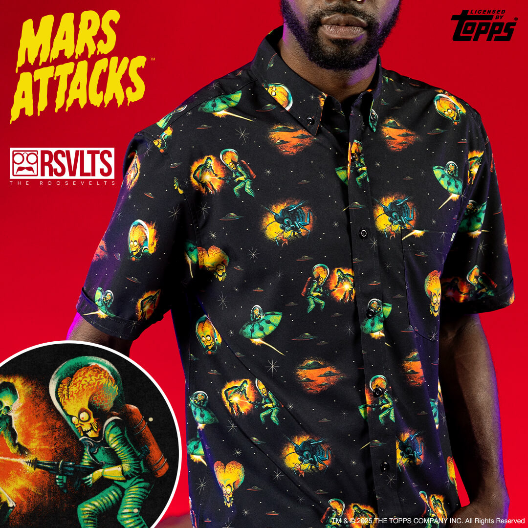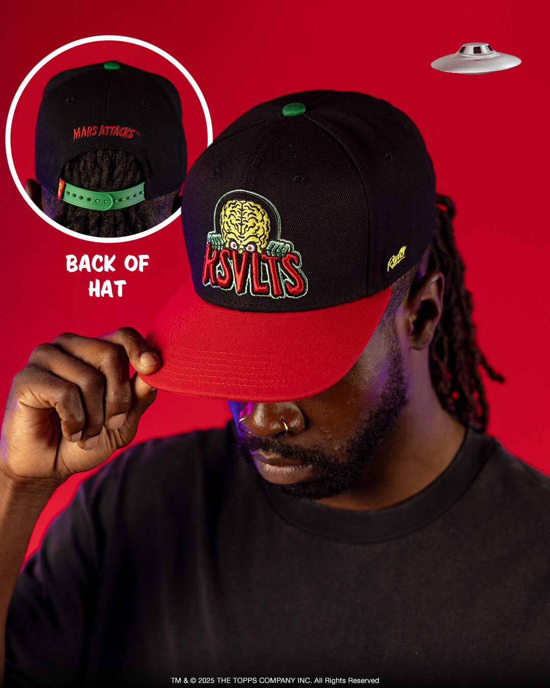 When 1960s sci-fi trading cards invade your wardrobe, you get our Mars Attacks campaign. RSVLTS partnered with Topps to reimagine the original cards as a collection of shirts, tees, and hats, using the bold reds, yellows, greens, and blacks as our guiding palette. A glowing desert cast in blue light set the stage, complete with 3D saucers hovering above to finish the invasion. For the first time, RSVLTS branding was integrated directly into the apparel designs, a detail fans quickly noticed, helping the campaign reach 330K+ inboxes, drive $60K+ in email revenue with a 67% open rate, and generate buzz amplified by the fan community.